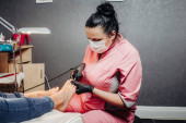 Wnętrze fryzjera w jasnych kolorach. Miejsce do strzyżenia włosów.