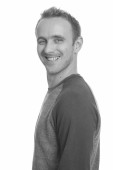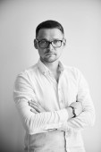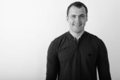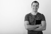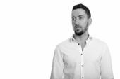 Studio shot człowieka w czarnej koszuli na szarym tle w czerni i bieli
