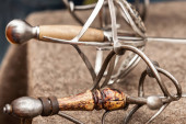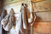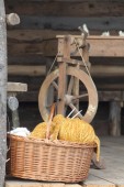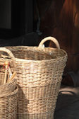 tradycyjny wiklinowy kosz wierzby stoi stary na stole roboczym kobiet igieł