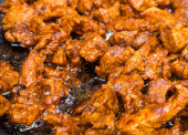 papryka wołowa, małe kawałki mięsa smażone i przyprawione tło kulinarne