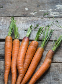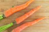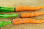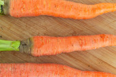 pomarańczowe marchewki są świeże i apetyczne z zielonymi wierzchołkami leżącymi równolegle z bliska