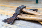 młotek drewniany młotek tradycyjny na tle siekiery na stole pana selektywne skupienie