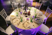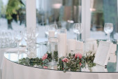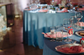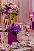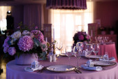 dekoracja uroczystej kolacji z kwiatami lilii i tulipanów na stole weselnym we wnętrzu restauracji. Ozdobiony stół do świętowania w fioletowych odcieniach.