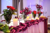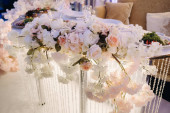 dekoracja uroczystej kolacji z kwiatami lilii na stole weselnym we wnętrzu restauracji.Wystrój ślubny