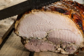 Domowej roboty pieczona wieprzowina z przyprawami na drewnianej desce.