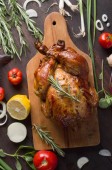 Pieczony kurczak podawany na drewnianej desce na stole.