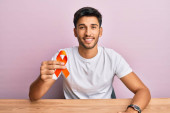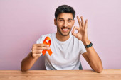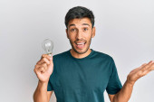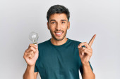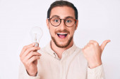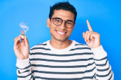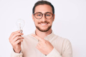 Młody przystojny mężczyzna trzyma żarówkę dla inspiracji i pomysł robi ok znak palcami, uśmiechnięty przyjazny gest doskonały symbol