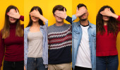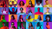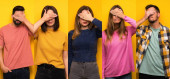 Kolaż młodych ludzi o jasnym wyrazie twarzy na kolorowym tle. Modny efekt duotonu