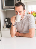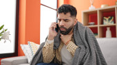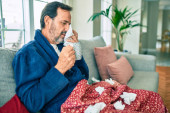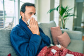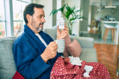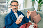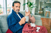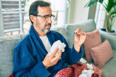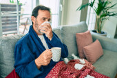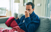Mężczyzna w średnim wieku chory na przeziębienie i gorączkę w domu, chory na grypę, siedzący na kanapie