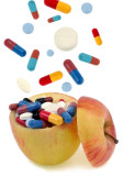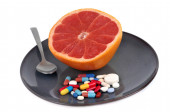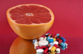 Grejpfrut z mieszanką narkotyków w talerzu na czarnym tle