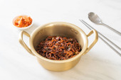 Koreański czarny spaghetti lub instant makaron z pieczonym sosem sojowym chajung (chapagetti) - koreański styl żywności