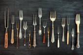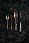 Vintage sztućce na ciemnym teksturowanym tle, widok z góry