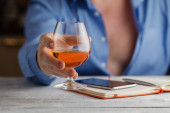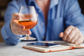 Kobieta, trzymająca jedną ręką szklankę piwa, a drugą, co może być smatfonem, e-bookiem lub tabletem, wszystko to w fotelu, z oknami w tle