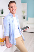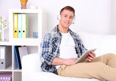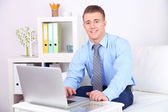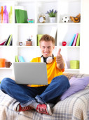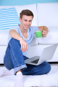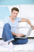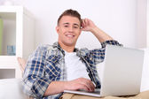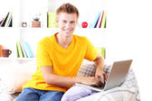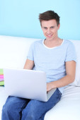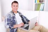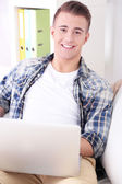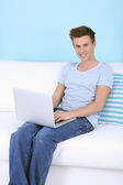 przystojny młody mężczyzna siedzi na kanapie z laptopem w pokoju