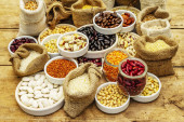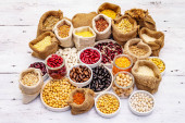 Zdjęcie "Różne rodzaje ziaren fasoli i zbóż. Zestaw niezbędnych źródeł białka dla zdrowego stylu życia. Białe drewniane deski tło" może być wykorzystywane do celów osobistych i komercyjnych zgodnie z warunkami zakupionej licencji Royalty-free. Obraz jest dostępny do pobrania w jakości wysokiej rozdzielczości do 5760x3840.