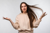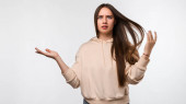 Zdjęcie oburzonej brunetki z długimi prostymi włosami, wskazuje na siebie palcem, otwiera usta w zaskoczeniu, ma niezadowolony wyraz twarzy, zaskoczony obraźliwymi słowami.