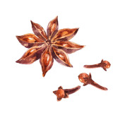 akwarelowa ilustracja zestawu przypraw: goździków, kardamonu i anyżu. Odizolowane na biało