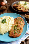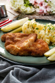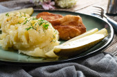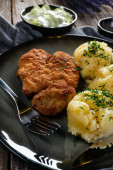 Kotlet wieprzowy podawany z tłuczonymi ziemniakami i sałatką ogórkową na ciemnym talerzu.