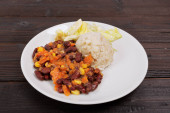 Obraz tradycyjnego brazylijskiego dania feijoada składający się z pięciu składników - feijoada, farofa, angielski sos, ryż i covey na białym talerzu