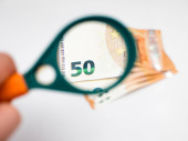 Banknoty 50 euro pod szkłem powiększającym na białym tle.