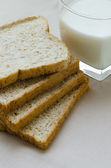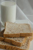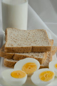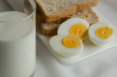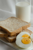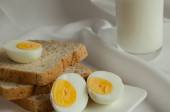 Chleb pełnoziarnisty, gotowane jajko i mleko na śniadanie.