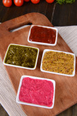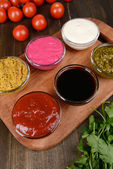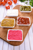 Zdjęcie "różne sosy na desce do krojenia na stół szczegół" może być wykorzystywane do celów osobistych i komercyjnych zgodnie z warunkami zakupionej licencji Royalty-free. Obraz jest dostępny do pobrania w jakości wysokiej rozdzielczości do 5760x3840.