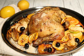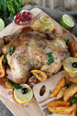 pieczony kurczak z warzywami i ziemniakami na desce, na tle drewniane