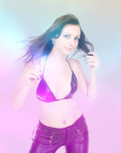 niesamowita dziewczyna w czarne skórzane spodnie. na białym tle