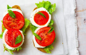 Zdjęcie "Bruschetta z pomidorami wiśniowymi, serem mozzarella i sosem pesto na drewnianej desce. Tradycyjna włoska przystawka lub przekąska, antipasto." może być wykorzystywane do celów osobistych i komercyjnych zgodnie z warunkami zakupionej licencji Royalty-free. Obraz jest dostępny do pobrania w jakości wysokiej rozdzielczości do 5760x3840.