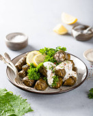 Dolma - nadziewane liście winogron z ryżem i mięsem. Tradycyjne tureckie i greckie danie. izolowany na białym tle
