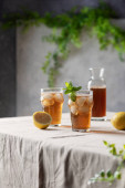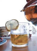 Kobieta leje czarną gorącą herbatę w szklance, selektywny obraz ostrości w stylu minimalizmu