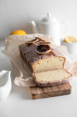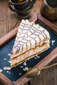 Słodkie domowe ciasto miodowe na czarnym stole z przyprawami. Pionowe