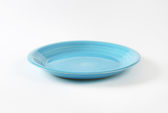 Dwa puste talerze na fioletowym ręczniku bawełnianym izolowane na białym tle.