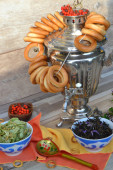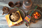 Pieczony kurczak z sosem żurawinowym i makaronem na ciemnym drewnianym tle