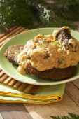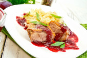 Smażony kurczak z sosem żurawinowym i makaronem zbliżenie