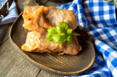 Pieczone nóżki zająca na rustykalnej drewnianej powierzchni z niebiesko-białą dekoracją
