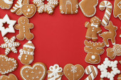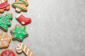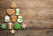 Wiele różnych pyszne ciasteczka świąteczne na drewnianym stole, płaskie leżaki. Miejsce na tekst