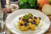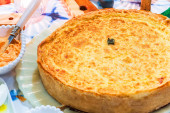 Pieczony kibe w szklanej misce z miętą, czosnkiem i cebulą. Brazylijska przekąska (Kibe de Forno). Widok z góry.
