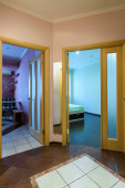Wnętrze korytarza w mieszkaniu, widok na drzwi wejściowe