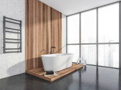 Zdjęcie "Narożnik stylowej łazienki z szarymi i drewnianymi ścianami i podłogą, okna z rozmytym krajobrazem miejskim i wygodnym podwójnym zlewem. 3d renderowanie" może być wykorzystywane do celów osobistych i komercyjnych zgodnie z warunkami zakupionej licencji Royalty-free. Obraz jest dostępny do pobrania w jakości wysokiej rozdzielczości do 5760x3840.