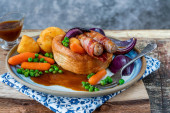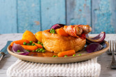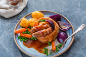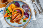 Kiełbaski z dziczyzny z warzywami, pieczonymi ziemniakami i sosem jagodowym