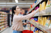 Zdjęcie "Młoda biała kobieta z eko-torbą na ramieniu wyjmuje paczkę szynki z lodówki. Widok z boku. Koncepcja zakupów i zakupów towarów." może być wykorzystywane do celów osobistych i komercyjnych zgodnie z warunkami zakupionej licencji Royalty-free. Obraz jest dostępny do pobrania w jakości wysokiej rozdzielczości do 5760x3840.