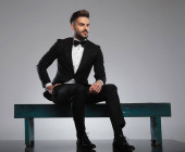 Zdjęcie "Pewny siebie pan młody trzymający się za ręce i planujący, noszący smoking siedząc na szarym tle studia" może być wykorzystywane do celów osobistych i komercyjnych zgodnie z warunkami zakupionej licencji Royalty-free. Obraz jest dostępny do pobrania w jakości wysokiej rozdzielczości do 5760x3840.