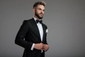 Pewny siebie pan młody trzymający się za ręce i planujący, noszący smoking siedząc na szarym tle studia