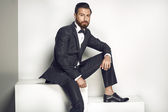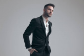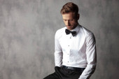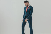 Pewny siebie pan młody trzyma się za rękę, blokując coś, nosząc smoking, siedząc na szarym tle studia