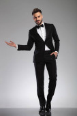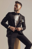 Podejrzany pan młody patrząc do przodu i nosząc smoking siedząc na szarym tle studio