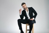 Zdjęcie "Przemyślany pan młody trzymający rękę w kieszeni i odwracający wzrok, noszący smoking siedząc na szarym tle studia" może być wykorzystywane do celów osobistych i komercyjnych zgodnie z warunkami zakupionej licencji Royalty-free. Obraz jest dostępny do pobrania w jakości wysokiej rozdzielczości do 5760x3840.