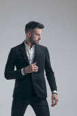 Przemyślany pan młody trzymający rękę w kieszeni i odwracający wzrok, noszący smoking siedząc na szarym tle studia