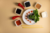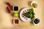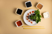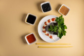 Zestaw bułek sushi serwowany jest na ciemnym tle. Pyszne tradycyjne japońskie jedzenie z bułkami sushi.