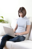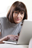piękna młoda kobieta wotking na laptopie w kuchni